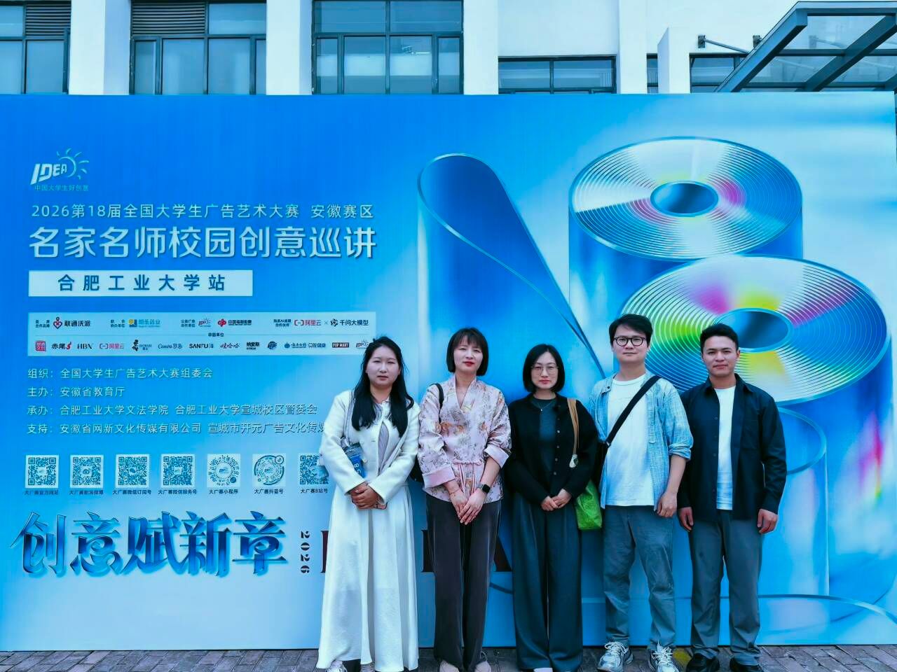 4月15日至17日,为深化专业实践教学改革,提升学科竞赛指导水平,文学与传媒学院郑珺、张媛媛、毕非易、陈宝华、程冉五位教师应邀赴合肥工业大学宣城校区,参加2026第18届全国大学生广告艺术大赛安徽赛区名家名师校园创意巡讲及第35届金犊奖国际竞赛全球校园创意分享会。